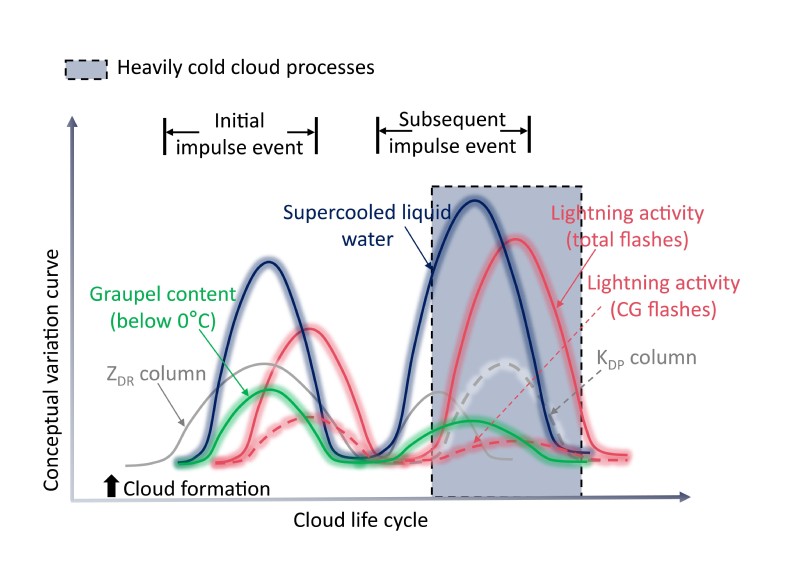 图4. 雷暴单体云生命期内闪电活动与ZDR(KDP)柱及微物理特征演变之间的物理秩序概念图。