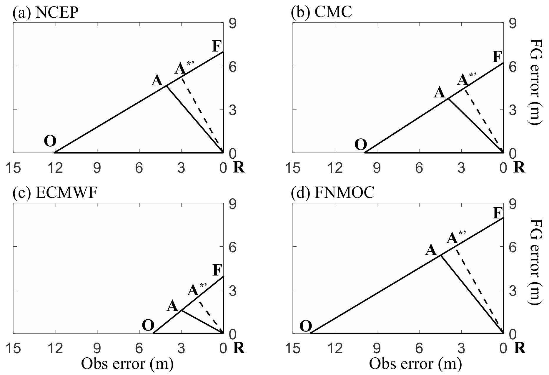 图2 (a)NCEP,(b)CMC,(c)ECMWF和(d)FNMOC的业务同化系统的最优和实际分析状态,观测状态和背景场状态的关系。