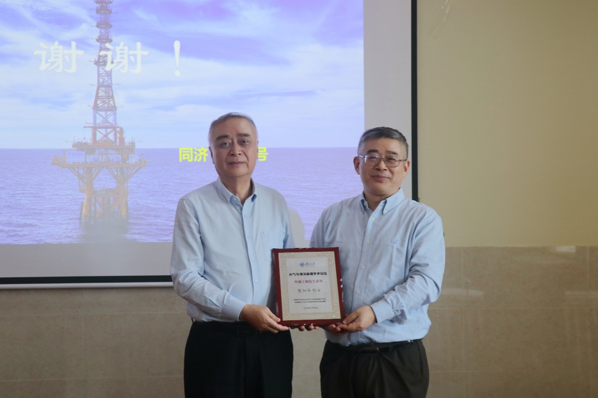 最后,张人禾院士向翦知湣院士赠送论坛特邀讲座嘉宾纪念牌,感谢特邀报告人为大气与海洋科学系作出的贡献。