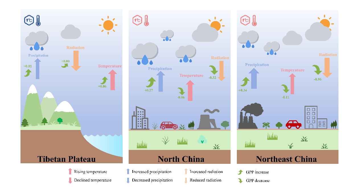 图4. 2001-2020年中国主要旱区气象因子变化对GPP趋势独立影响的概念图。
