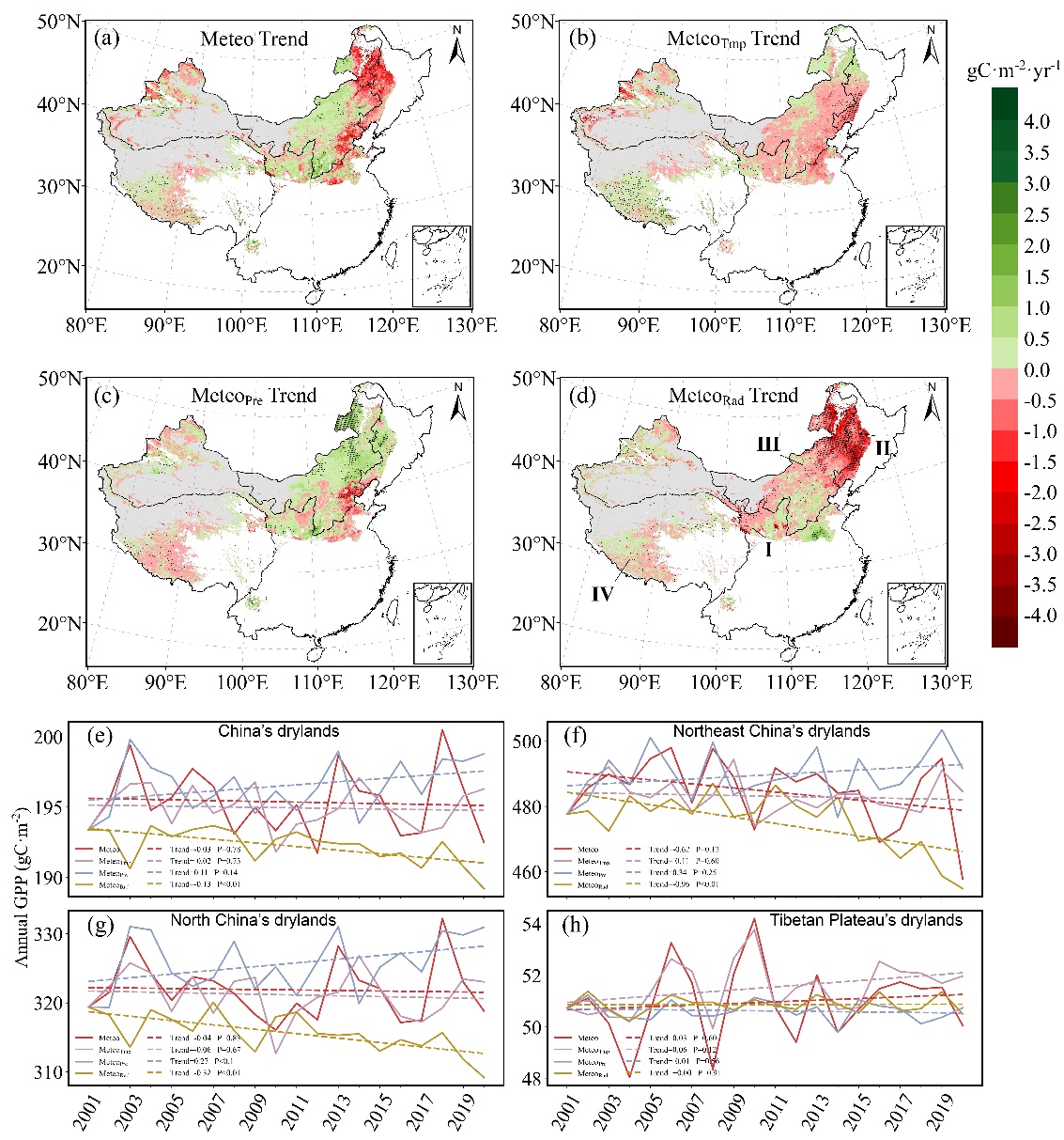 图1. 2001-2020年不同情景下中国旱区GPP的年际变化和线性趋势。(a-d)Meteo、MeteoTmp、MeteoPre和MeteoRad情景下GPP年际线性趋势的空间分布,(e-h)以及不同区域中不同情景下GPP的年际变化。打点区域表示超过95%置信水平的显著趋势。罗马数字Ⅰ至Ⅳ分别代表中国旱区、东北旱区、华北旱区以及青藏高原旱区。