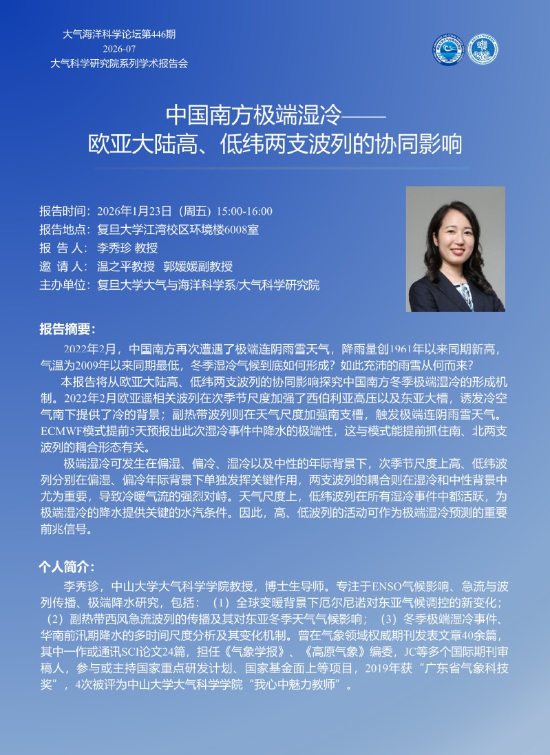 2026/01/23 -李秀珍- 中国南方极端湿冷——欧亚大陆高、低纬两支波列的协同影响