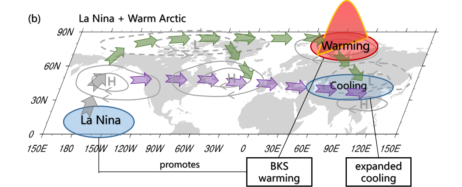 2 a)厄尔尼诺对欧亚大陆极端低温事件的影响机制图;(b)拉尼娜和暖BKS对欧亚大陆冷异常的协同影响机制图;箭头表示强罗斯贝波能量传播