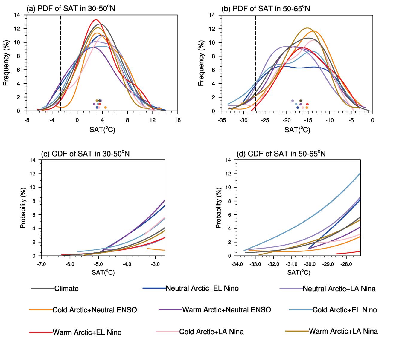 3 a)和(b)在8种不同北极热力状况和ENSO组合条件下欧亚大陆冬季(DJF)区域(图4.7中的紫色框区域)平均日SAT概率密度函数(PDF)。虚线表示10百分位阈值,九个点表示每个条件下的日气温平均值。(c)和(d)与(a)和(b)相同,但为累积分布函数(CDF),仅显示低于10百分位阈值的极端低温事件概率
