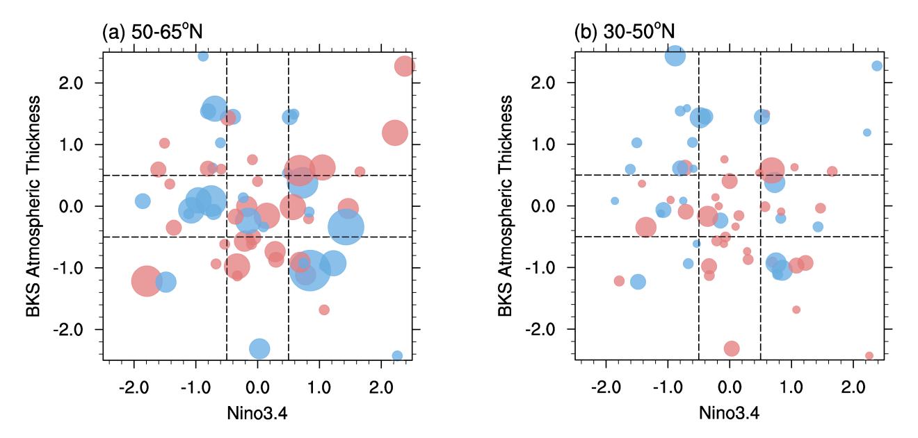 1 a50-65°N和(b30-50°N80-120°E在不同北极热力状况和ENSO条件下的SAT异常散点图。负值为蓝色,正值为红色;点的大小表示气温异常的程度